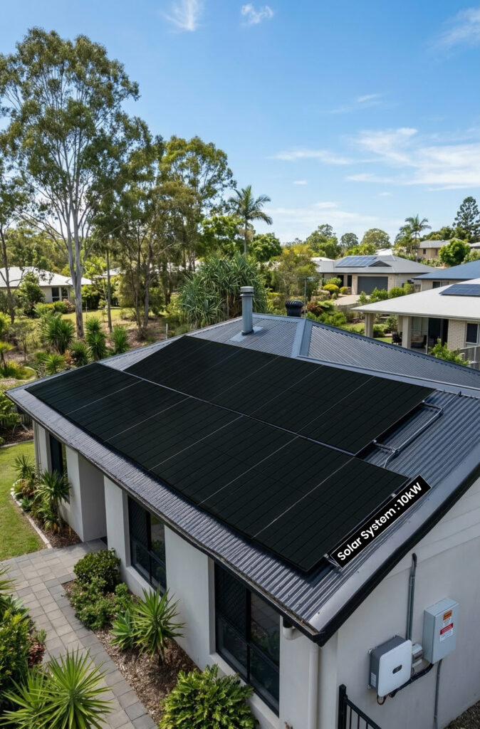 A 10kW solar system is one of the largest residential and small commercial solar installations available in Australia. Typically comprising 22–26 high-efficiency panels paired with a 10kW inverter, it generates 38–44 kWh of electricity on a standard Queensland sunny day — more than enough to power a large family home with ducted air conditioning, a pool, and an electric vehicle charger running simultaneously.